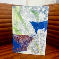 This fine art card captures the charm of the Highland cow, set against a textured background created by printing real grasses for a natural touch. The original artwork is crafted with a blend of monoprint and colored pencil, adding depth and detail to this iconic animal. Each card comes with an envelope and is printed on high-quality cardstock in a portrait format (127mm x 178mm). Blank inside, it is versatile and suitable for any occasion.