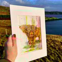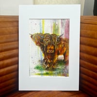 This fine art giclée print (140x190 mms) features a vibrant Highland cow duo, capturing their character and charm against a richly textured background. Created with a combination of monoprint and acrylic paint, the original artwork showcases layers of colour and detail. Each print is hand-embellished with rose gold metallic leaf, adding a unique and luxurious touch. Printed on archival-quality paper with non-fade inks, this A5-sized piece brings the beauty of the Highlands into any space, ensuring lasting colour and clarity for years to come.