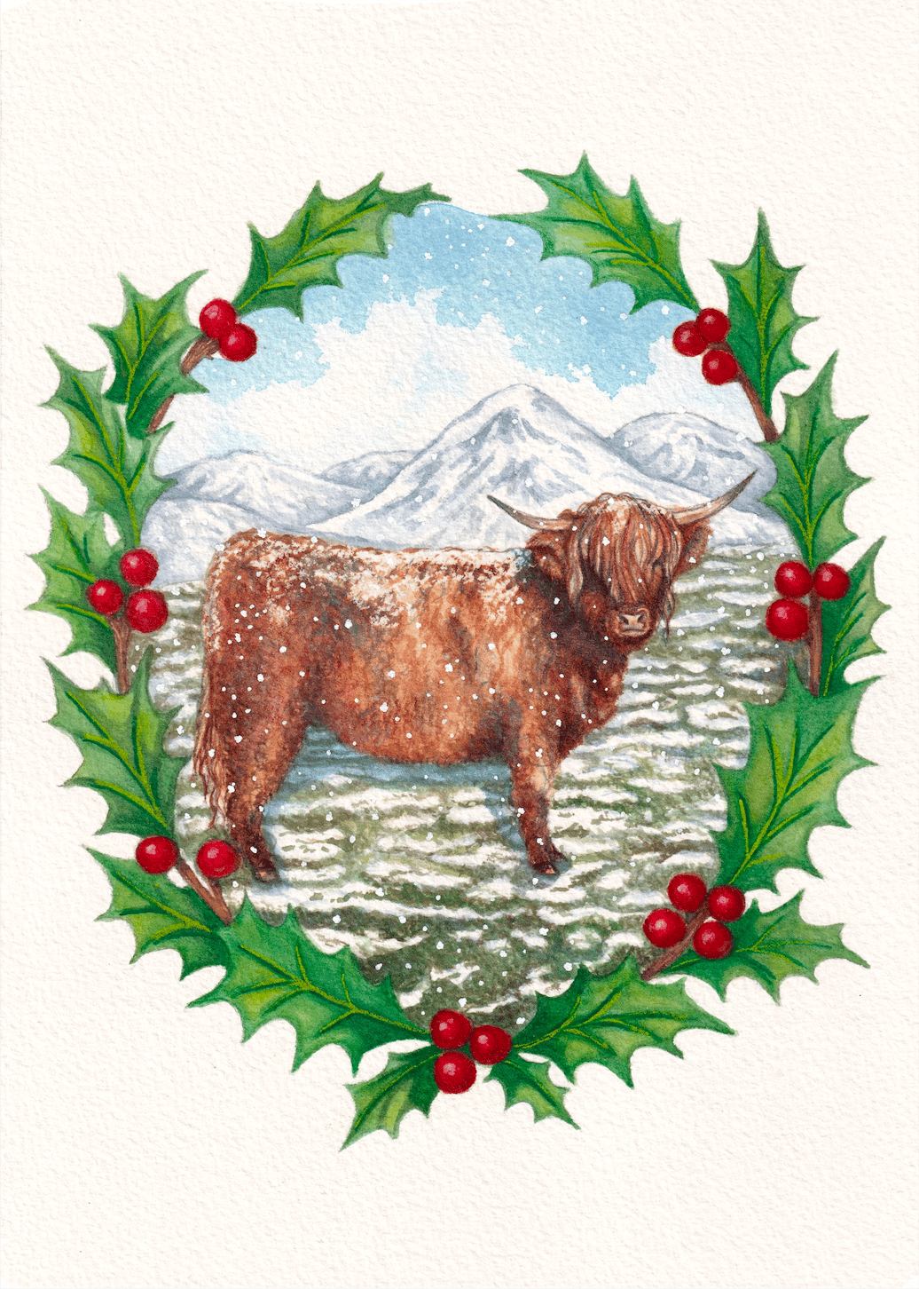 My final Christmas design for this year β a Highland Coo standing proudly in a frosty wilderness. The original artwork is a watercolour, inspired by a local cow who always seems to appear picture-perfect against the winter landscape.